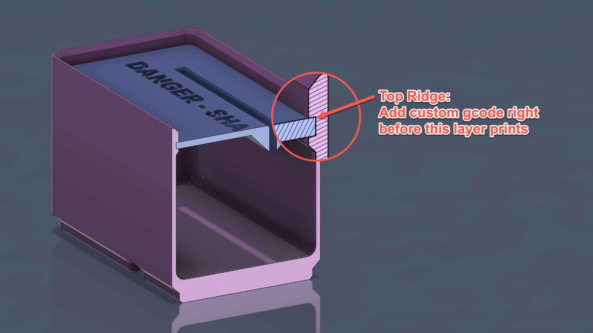 Open the body file in your slicer. Slice it with your desired settings. You will see an overhang toward the top. This is the "top ridge". We will need to add some custom gcode right before this layer prints