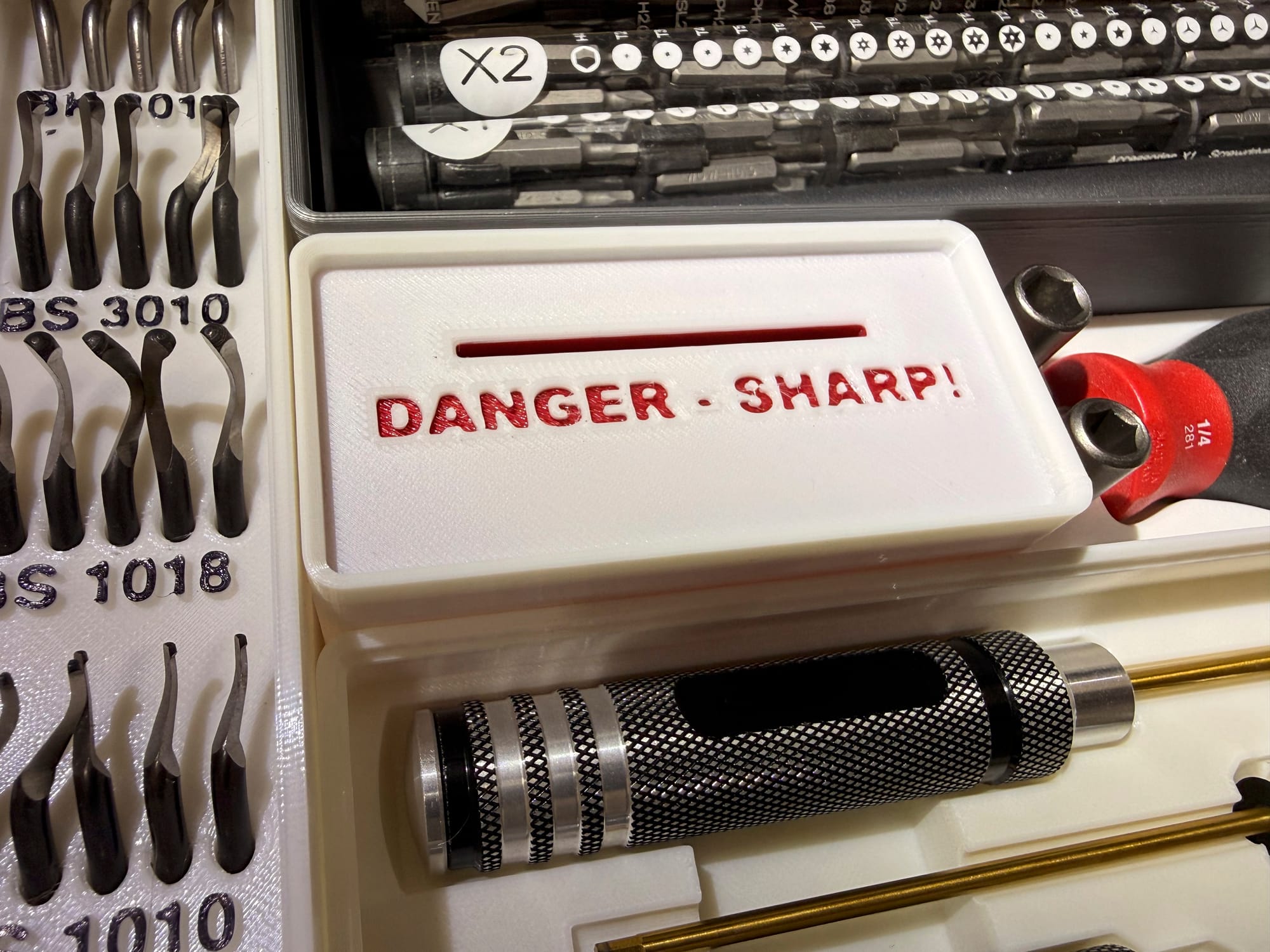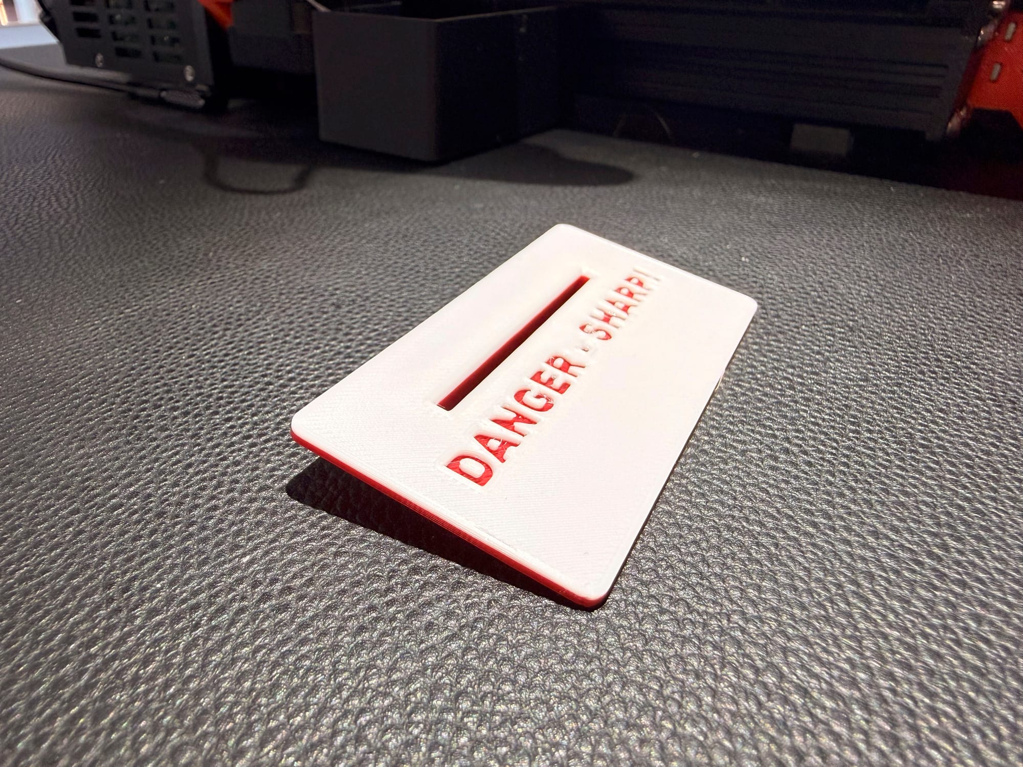 Yup, we are going to start with the top. So open up one of the top variants in your slicer. There is one with the words DANGER - SHARP! already cut into the face. Or you can use the blank variant to add your own text, or just leave it blank. Check the video above for instructions